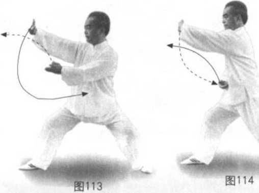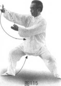 【要点】 这动作练时速度很快。要求:两臂手上下、前后相错,劲 要圆,勿出现棱角。(图115)