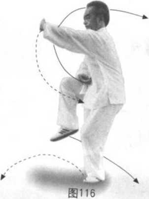 动作三:身向右转约135度,螺旋上升,重心全部放在左腿。左腿逆缠里 转,以前脚掌为轴随身略向右里转后,脚掌踏实;右腿顺缠外转屈膝里合、 脚提起。同时左手由胸前逆缠上翻向前上展开、臂半圆、坐腕,位在两眼中 线前、掌心向前偏上,指尖向右里上;右手由两眼前中线顺缠下沉里合至腹 前上,掌心偏左侧上,指尖偏左侧下。眼看左手前,耳听身后。(图116)