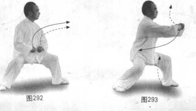 身先略向左转,螺旋略上升,再向右转约50度螺旋下沉,再向左转约 50度螺旋略上升,重心左、右、左。左腿先顺缠外转,膝里扣,再逆缠里 转,五趾抓地,再向前蹉步,以脚跟顿地发劲,脚掌踏实,五趾抓地;右腿 先逆缠里转,再顺缠外转,膝里扣,五趾抓地,再逆缠里转,(与左脚同时) 蹉步向前,以脚跟顿地发劲,脚掌踏实,五趾抓地。同时,双拳先双逆缠向 前上里折腕,再变双顺缠下沉至裆前下中线,再变双逆缠经腹前向胸前发 劲,左拳在前,右拳略后,拳心斜错相对,间距约10厘米,眼看前兼顾左 右,耳听身后。(图292、293)