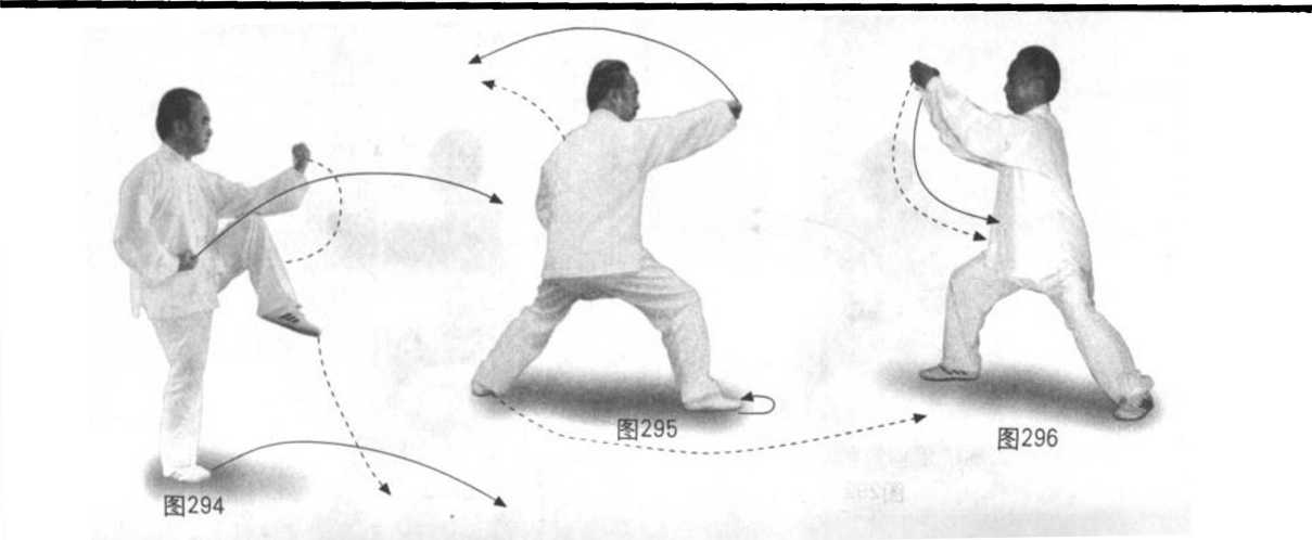 动作二:身向左转约180度。先螺旋上升后螺旋下沉,重心右、左、偏 右。右腿先逆缠里转(当左脚外转踏地后)、屈膝提脚随身腾空跃步旋转 180度后下沉着地、脚掌踏实五趾抓地;左脚脚跟蹬地,再随身腾空,先向 左跨出一步,旋转180度后着地,脚掌踏实,五趾抓地。同时右拳逆缠里转 向左前上领劲击出,当转身未落地时变顺缠由头右侧屈肘回身向前击出,位 在胸前,拳心略偏左上;左拳由眼前逆缠里转屈肘收回至左肋旁,当回身未 下沉落地时,拳由左肋旁经胸前向前上击出,略下沉,位在眼前,拳心略偏 右上。双拳心相对,右拳略前,左拳略后。眼瞻前顾后,耳听身后。(图 295、 296)