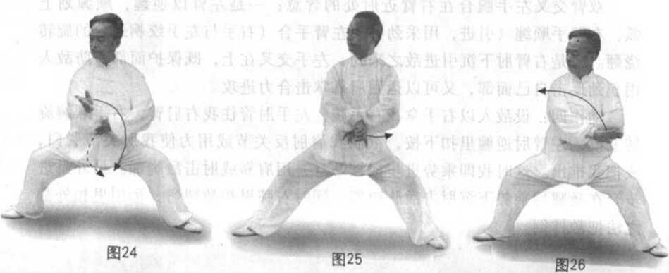 动作一:身向左转螺旋下沉,重心偏左,眼看右手再看右肘外侧,耳听 左后。同时左膝里扣,右腿逆缠。右手从右前上先逆后顺缠下沉经身前至腹 前中线,掌心向左略偏前,手腕向后弯成约45度角的弧形,中、食、无名 指后弯偏于右前方,掌指距离腹部约四拳之隔;左手指尖向右,以小指横贴 腹部,掌心向上,随身转略变逆缠下沉,小指尖仍贴腹部,掌心斜向里上, 左腕、肘部略外棚下沉与左膝相合。(图24)