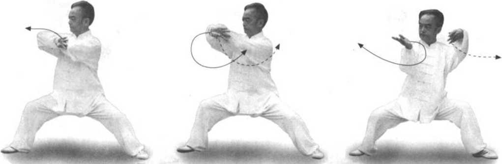 【要点】这个动作练时较快,右肘略向右前上挑,左肘向左外下 沉,形成左肘下、右肘上的斜线双开和对称劲,即对拉拔长。