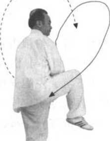 动作二:接上动作,这时另一敌人乘我左边单腿站地,从我身右后侧进 左步,用右脚向我右腿或左腿蹬来,欲将我蹬伤使我跌倒。我即乘势向右 转,左腿逆缠脚里转,右膝上提护裆,以避敌右脚蹬我之劲。同时右拳由右 腿里侧逆缠上翻经胸前变顺缠向右外上翻、再向右外下沉向敌右腿迎面骨以 下采劲截击,使其右腿迎面骨被采击受伤倒地;我左拳以逆顺缠经身左侧上 翻至左耳左侧,以保持身体平衡稳定。此势在推手中运用双臂冽采劲,非常 有效。