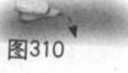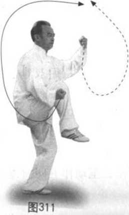 动作一:身快速略向左转略下沉,重心在左。左腿顺缠外转,膝里扣, 脚掌踏实五耻抓地;右腿逆缠里转膝合,脚提起。同时右拳逆缠里转下沉 (与右脚同时收回)至右膝里侧,拳心向里,虎口向左前;左拳逆缠下沉至 左大腿左前,拳心向里,虎口向右前。眼看身右侧兼顾左,耳听身左后。 (图 310)