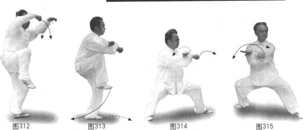 动作一:身微向左转螺旋微上升再向右转螺旋下沉。左腿先微顺缠,膝 里扣,再变逆缠里转随身下沉,脚尖里合上翘向左前方迈步以脚跟里侧着 地;右腿先微逆缠里转,膝上提变顺缠外转,脚尖向右外转,随身下沉震 脚,五趾抓地,重心移右,变实。同时右拳先略顺缠外开坠肘,拳向上翻至 右肋变逆缠勾腕里合上翻,再经胸前上向左前下沉,外勾腕,拳虚握,拳心 向右;左拳变掌微顺缠微外开变逆缠里合经前上向前略下沉合于右腕臂上, 略里勾腕,掌心向右前下,指尖向右前上。双臂腕交叉点在胸前。眼先左右 再看前,耳听身后。(图312-315)