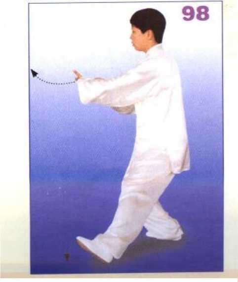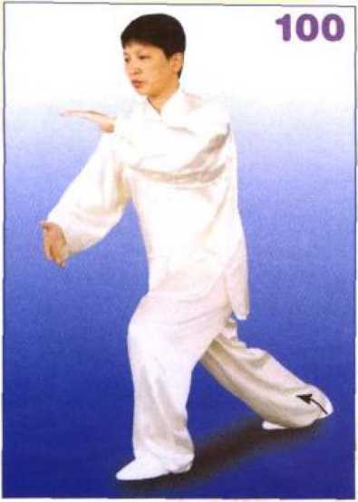;同时左掌向左前方分举, 掌心斜向内,高与肩平;右掌按于右 胯外侧,掌心向下,两臂均成半圆形; 眼看左前方。(图97、98、99)