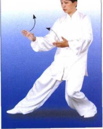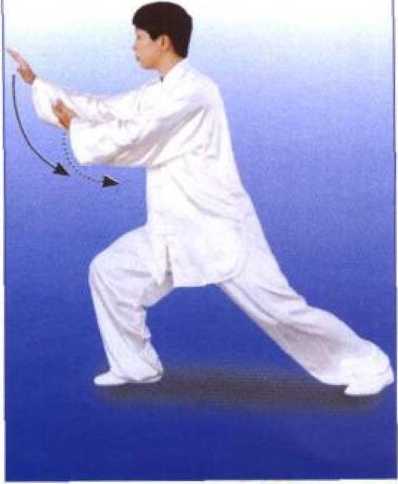 左腿伸 直,成右弓步;同时身体右转,以右 前臂外侧和右掌背向前才朋出,高与肩 平,掌心向里;左掌置于右前臂下方, 掌心向外;眼看前方。(图14、15、 16)