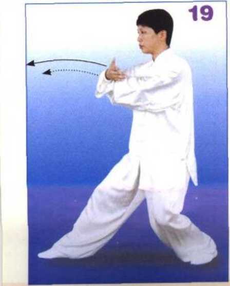 身体微右转,右前臂屈举于胸前, 掌心向里;左掌扶于右前臂内侧,掌 心向外;同时重心前移,右腿屈膝前 弓,左腿伸直成右弓步;随即以右前 臂外侧为力点,向前徐徐挤出;左掌 扶于右前臂内侧,高与胸平;眼看前 方。(图 19、20)
