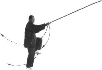 紧接上动,左脚向前踩落,右手握棍上捋,使棍前端沿身左侧向后挂;同时,右手 沿棍向下捋,左手则顺势向上捋,两手倒把;动作不停,右脚向前方趟进一大步,左脚