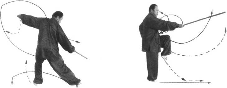 倒把棍要熟练、迅速,不可脱把;炮棍的右 手拧把向右侧上之撑,左手向前推戳之打与炮拳 之劲意相同;打出之棍要两脚配合、劲力要刚猛, 步棍齐到