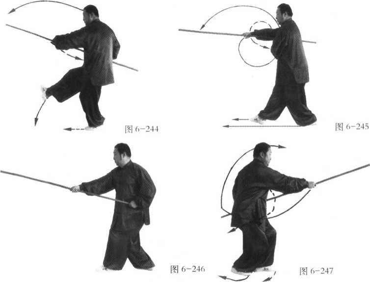 图 6-248 图 6-249图 6-248 图 6-249随右脚后撤上举至肩前;左手握棍随转身下压至左膝 前方;目视左前方(图6-250)。