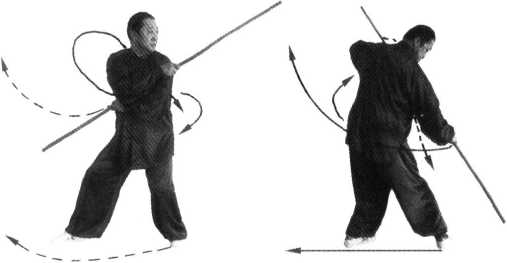 3. 不停,身向右转,右脚经后脚后方向后撤一步成三体桩步;同时,右手握棍由下