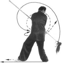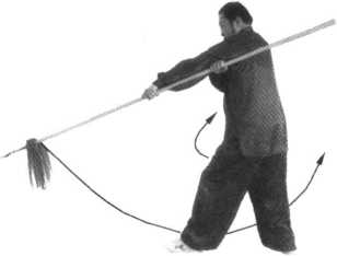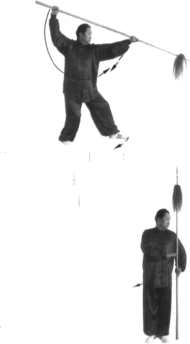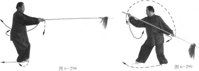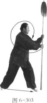 1. 身体向右转,右脚随即后撤一步, 扣左脚尖回身成三体桩步;同时,右手握 把,手心由下向外拧,由身前自下向后拉 至右肩的右上方;左手捋把下沉落于左胯 后方,手心向外;目视右把前方(图6- 299);不停,身体重心移至右脚,继续向 右转,左脚向右脚前方扣步;同时,左手 握枪由后经头上,向前、向下抡落至身体 左侧下方;右手则同时捋把下沉向 左腋下运行,此时,枪把绕至身后 上方(图6-300 );不停,身体继续 右转,左手借向下抡的惯性随转身 使枪在身前由左下方向右下方挂出; 目视枪尖(图6-301 );不停,身体 继续右转,重心迅速后移至左脚; 右脚随转体由左脚后沿直线后撤, 后撤时要借左脚后蹬之力,撤出一 大步;右脚落地的同时,左脚贴地 亦后撤半步成三体桩步;借转身退 步之力的同时,右手捋把在身前向 下、向右、向上、向后挂举至右肩 上方;左手同时捋把配合抡挂之力, 使枪尖由右向上、向左、向下、向右,使枪的前端向前上方推起、架撑而出;枪停于头 上方,前低、后高,斜向架撑;目视前方(图6-302)。
