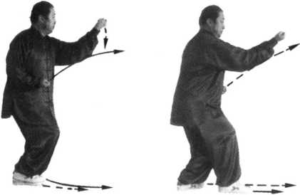 两掌变拳后,趟步、提步、上步与右拳拧挣打出同时动作,手脚齐到;出右拳时, 右拳之“外劳宫穴”要用力按摩、刺激左肘下主要穴位;定式时两膝眼相贴合气道。