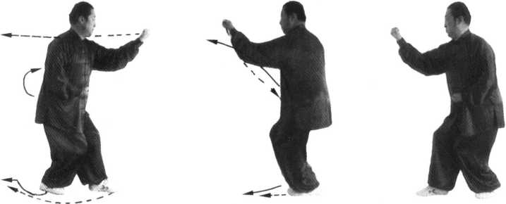有拳拧挣打出与左脚同时进行,手脚齐到;三个动作一气呵成,身体只横转,不可