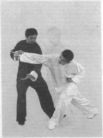 (1)甲乙相对站立。乙 提左脚向前上步,同时,用 右拳向甲胸、面部打出;甲 提左脚向前上步,同时迅速 抬起右手向前搠接乙右手腕 外侧,顺势握住,向右引采, 将乙右臂拉直,接着,抬起 左手转至腹前,身体随之右 转,用左上臂靠击乙右肘部, 使乙肘部受击(有受伤、折 断之险,练习时务加小心) (图 7-134、图 7-135)。图 7-135图 7-135