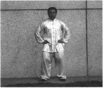 方法:强力夹裆,然后放松圆裆,膝与脚尖同向,正反用力 体会后者的本体感觉(见图3-15、3-16)。