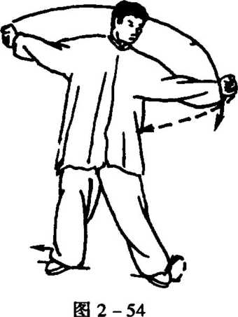 同时,两手变拳,随向左后反抡左臂,左拳成反背立臂拳至右肩 侧下,右拳立拳展伸右肩侧上,眼看左拳(图2 - 54)。