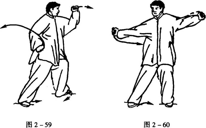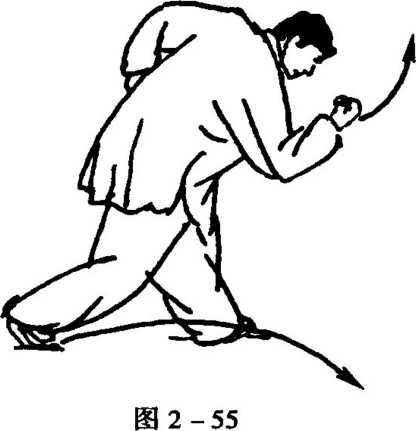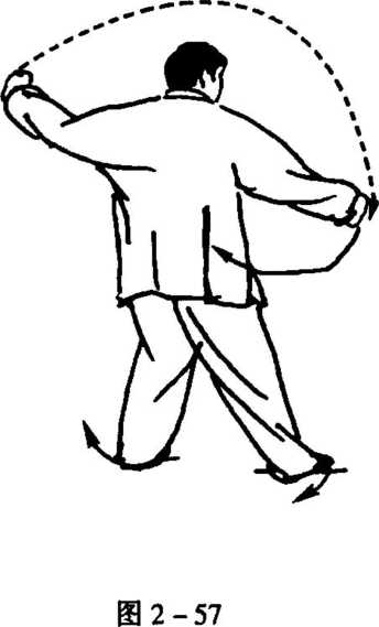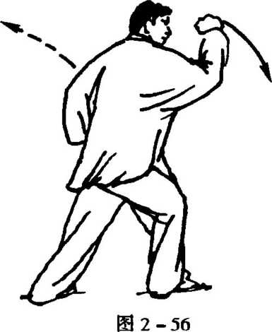4. 随向后移身,左膝微屈,左脚变实,右腿展直;同时,右拳 展而向右肩侧下,左拳立而外展左肩侧上,眼看右拳(图2- 57)〇