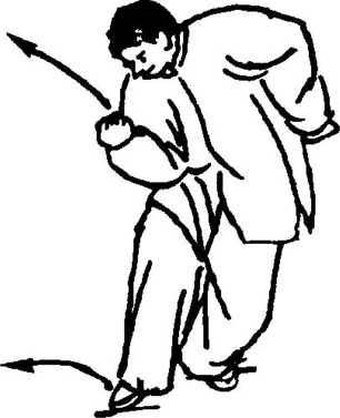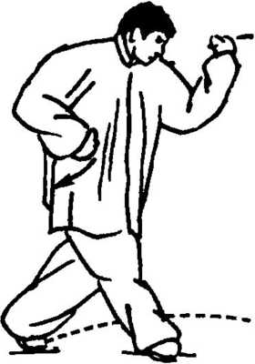 1. 接上动。右脚尖里扣,右脚仍实,随重心前移,左脚前提, 随左后翻身,左脚向左后(东北)摆而跨落,全脚着地,重心在右;