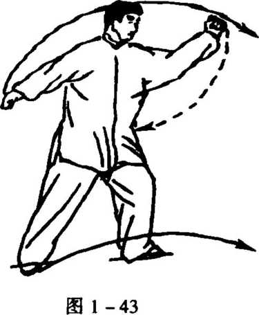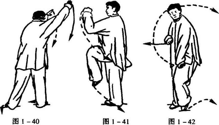 (1) 图1 -43、图1 -44要连而急就,合为一拍,两拳同伴 “啊”音。步如卷地风,拳臂如闪电,以惊急成奇,一身翻转极柔, 连环劈拳极刚。