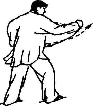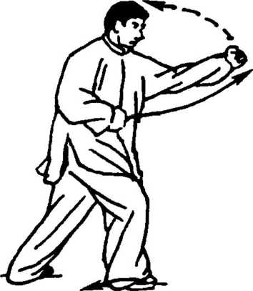 图 1 -44上立拳劈下,成右劈砸捶,高不低于肩,眼看右拳(图1 -44)