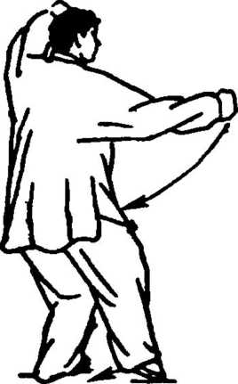 1. 接上动。随稍屈右膝,左脚落右脚内侧,脚尖点地,成左 丁步;同时,又随左转身含胸,沉裹左肩,内滚左臂,左拳向下扣 搭左大腿内侧,拳心朝左;右拳则向前上提扣右膈前,转脸睨视 左后方(图1 -42)。