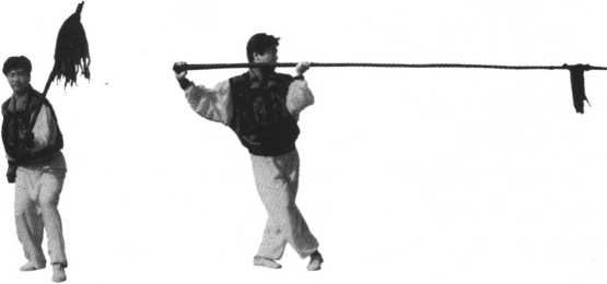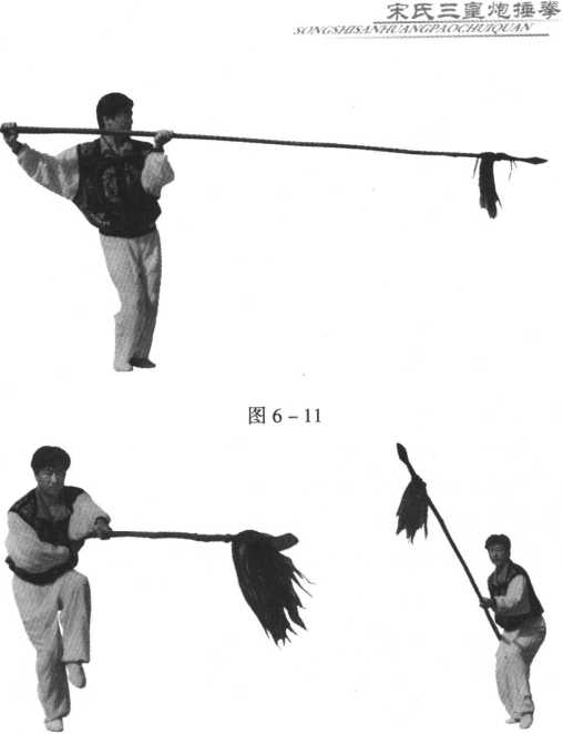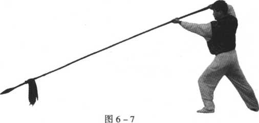 左脚套步向前横跨出一步,落于右脚之前,身体侧斜,以腰 带臂,握枪双手逆时针划圆,目视枪尖(图6 - 16)。