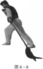 图 6-9 @6-10随身体重心前移,右脚向前迈过左 脚,置于左腿前,脚尖外撇;右手握枪向 前挺出的同时向下猛砸,目视枪尖(图 6-10)〇
