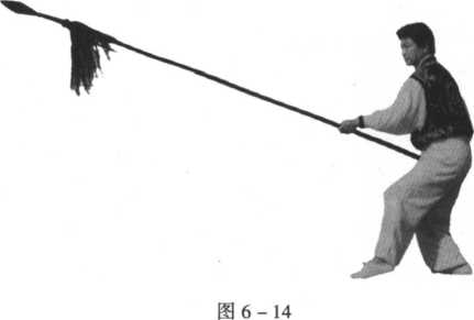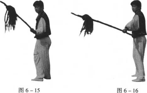 右脚向前迈出一步,落于左脚之前,脚尖外别;以腰带臂,握 枪双手逆时针划圆,目视枪尖(图6 - 15)。