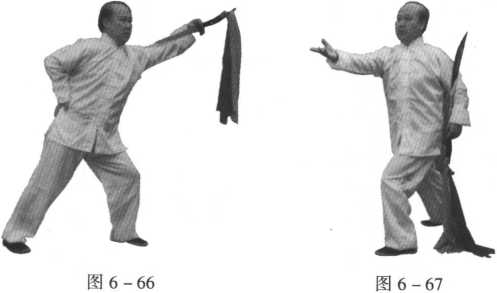 刻抬左臂在身前虚晃一下,然后落在身体左外侧,刀背躺在左臂 上;右手从腰部掏出暗器,随身体转动面对正前方时投出去;双 脚站成左弓步,目视暗器投出的方向(图6-65、图6-66、图 6-67)。