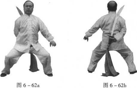 变成马步,重心置于双腿之上,目视右侧(图6-62a、图6- 62b) 〇