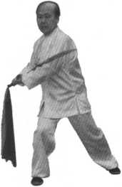 当右手刀花拨到内侧时,突然刀 尖插向身体背后左侧,藏刀于身背后, 刀尖置于右肩头后面,左手虎爪掌自 然向身体左侧下方推按,双脚由弓步