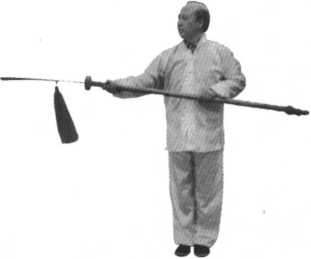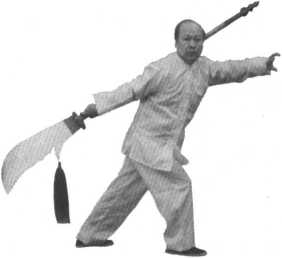 随身体向左扭转90°之机,右手提刀翻臂抬至胸前,左手虎 爪掌回收,左手握在大刀柄下端部位;同时,左脚回收并向左前