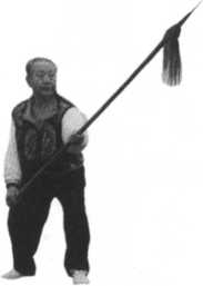 五虎断门枪是在子路大枪劈、砸、滚、翻四大合力的功法、枪 法基础上升华出来的〇五虎断门枪共有六路枪法,又叫“小枪”。先贤云:刀为兵器之祖;剑为兵器之师;枪为兵器之帅。在 冷兵器时代,枪长大、灵活,通称长矛。枪分为大枪、小枪、花枪、 双枪、滑枪等。在传统的对练中,有单刀进枪、双刀进枪、大刀进 枪、双朴刀进枪等。枪扎一条线,但有巧、灵、活、快、抖、重、猛、轻等优势。五虎断门枪枪法有崩、挑、撞、剁、砸、劈、滚、翻、刺等九个 枪点。⑴崩劲左脚抬起,右手高起扑推枪樽,左 手握在枪杆中间部位,为定支点,劲贯、崩到枪长(图6-134)。