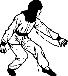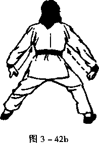 前动不停,落左脚向左转身 180°,右脚向前横跨出一步,呈马步;同时,两爪变成虎爪掌,由 胸前向下猛按至两跨侧,两虎口向里,目视前方(图3 -42b)。
