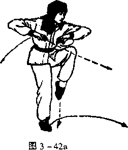 提左脚,绷脚面,护右膝,两爪 提至胸前,爪心向下,目视左前下 方(图 3-42a)。