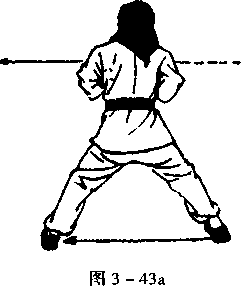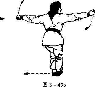 前动不停,将右脚并于左脚;同时,两拳由胸两侧向体两侧 冲击,左拳心向下,右拳心向上,目视右拳(图3 -43b)。