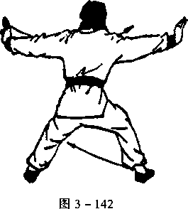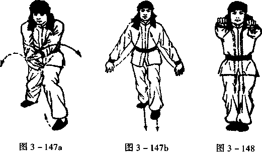上动不停,双掌向下翻掌变虎爪掌,向外、向 后分出与腰横成一线,虎口向里;左脚同时收回,图3_146 成左虚步,目视前方(图3 - 147b)。