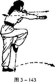 右脚提起,屈膝,绷脚面,护左膝;同时,右掌变虎爪,爪心向 上;左掌变拳,由左经胸前将拳搭于右大臂之上,拳心向上,目视 右爪(图3-143)。
