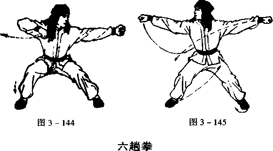 右脚直下震跺,左脚向左擦地跨出一步,向左转体90°,成 马步;同时,右爪变拳拉至右胸前,屈肘直大臂,拳眼向里;左拳 顺肩冲出,拳眼向上,目视左拳(图3 - 144)。