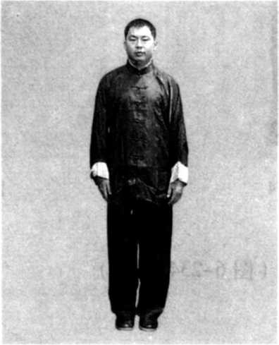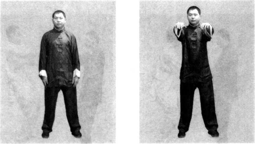 (1) 两脚并拢,身体舒松,自然站立(胸向南),头上顶, 立项,下颌微内收,舒胸松腹,肩臂松垂,两手轻贴两大腿外 侧,指尖向下,掌心向内,舒指展掌;精神集中,呼吸自然; 两眼平视(图7-1 )。