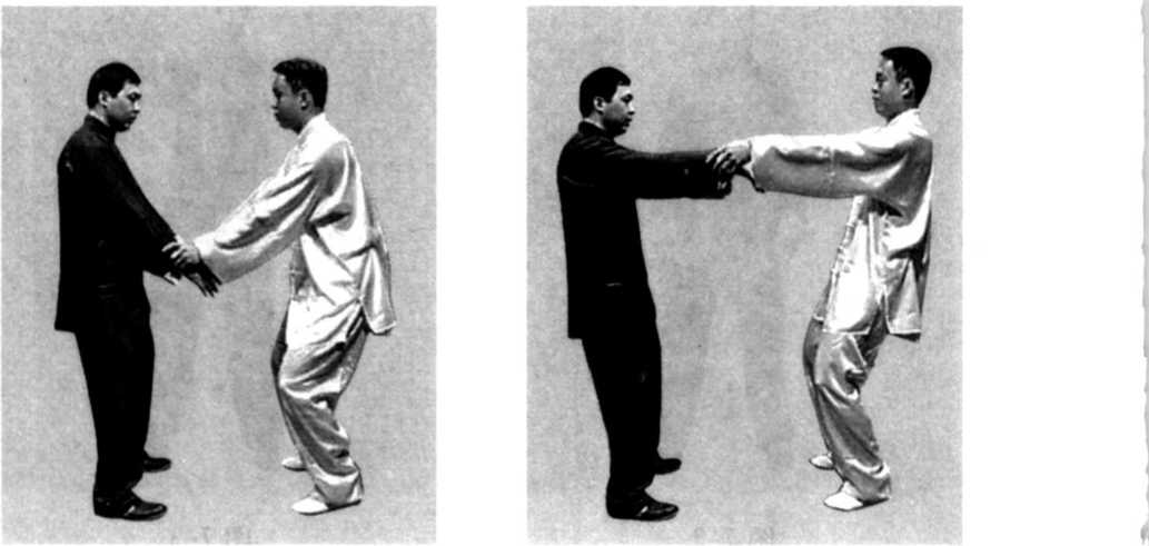 阁7-5 图7-6手向前拿握甲的两腕,并用力向前推按;甲用两手腕棚住乙的 按势,接着,两手变逆缠,将乙的两臂引直,紧接着,两手向 上发力,使乙向后仰出(图7-5、6)。