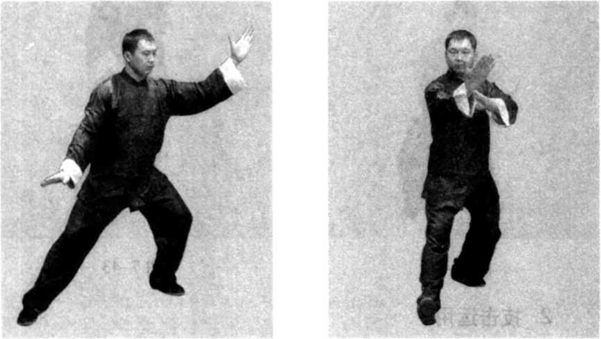 (2) 身法不变,右脚尖落地踏实,向前弓膝塌劲,左腿自然 伸直,形成右弓步;同时,右手向下切挤,身体随之向前,左手仍