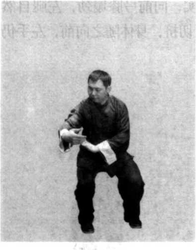 (3) 身体稍右转,右腿弓 住塌劲,身体重心移至右腿, 提起左脚向前上步,落在右脚 的左侧,形成马步;同时,右 手向右前下方挤出,接着,逆 缠向上挤至额前上方,掌心斜 向上,掌指斜向左,臂呈弧 形,左手向下按转至腹前,掌 心向下,掌指向右,与此同 时,两腿徐徐站起;眼看前方 (图 7-42、43 )。