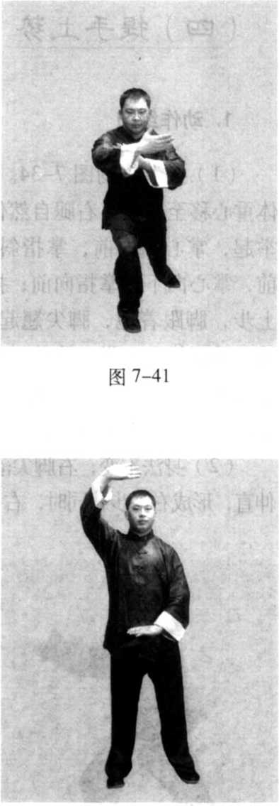 (1) 接上势的图7-34。身体稍左转,左腿弓膝塌劲,身 体重心移至左腿,右腿自然伸直;同时,左手顺缠向左前上方 举起,掌心斜向前,掌指斜向上,右手变掌,向下落至右胯 前,掌心向下,掌指向前;接着,身体稍右转,提起右脚向前 上步,脚跟着地,脚尖翘起,形成右前虚步;同时,右手顺 缠,沿弧线向上举至胸前,掌心斜向上,掌指斜向前上方,臂 呈弧形,左手逆缠向下向前转至右腕内侧,掌指贴于右腕上, 掌心向下,眼看前方(图7-39、40)。