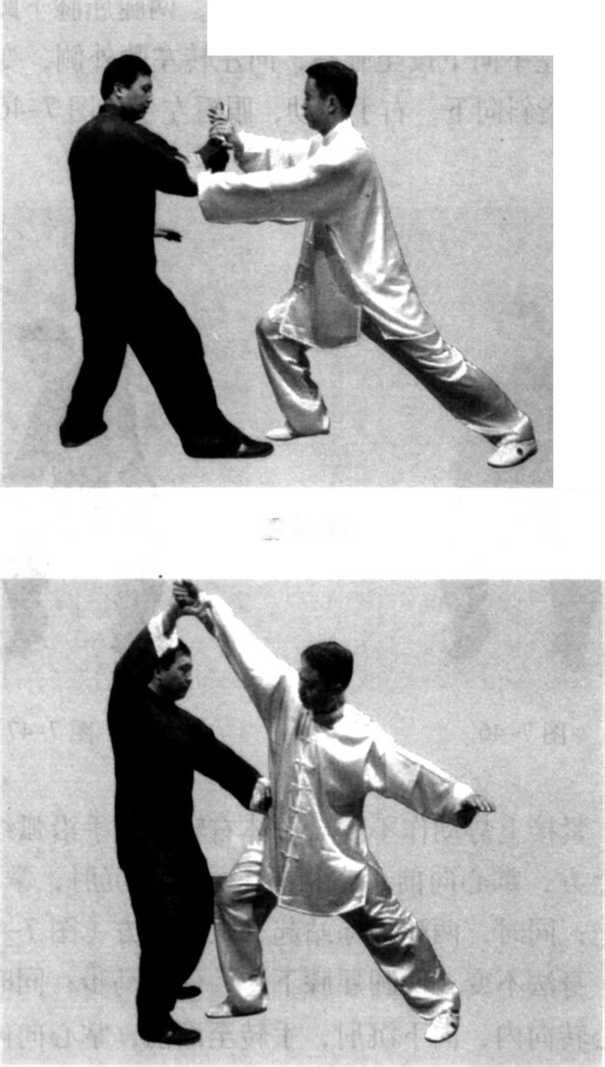 手,用右臂向前棚乙胸部;乙迅速抬起右脚向前上步,落在甲 的右脚内侧,抬起双手按在甲的右臂上,使甲右臂不能触击胸 部而落空;甲见棚势被化解,右肘向下松沉,右手逆缠拿握乙 右腕,向右前上方引采,提起左脚向前上步,同时,用左掌猛 击乙的右肋部,将乙打出(图7-44、45)。