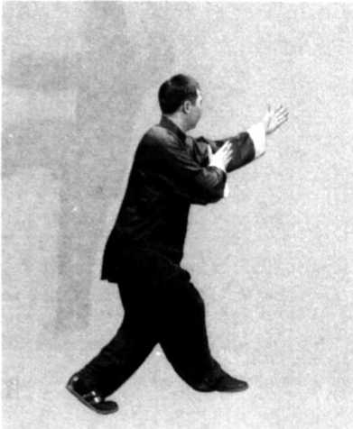 (4) 身体稍右转,右腿屈膝塌劲,左脚向左侧撤步,落地 踏实,左腿自然伸直,身体重心仍至右腿,形成右弓步;同 时,右拳变掌,顺缠向下劈落,与肩同高,掌心向左,掌指向 前,左拳变掌向右转至右肘内下侧,掌心向内,掌指斜向前,