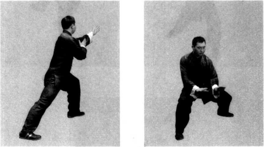 地踏实,弓膝塌劲,身体重心移至左腿,提起右脚向右侧撤 步,腿自然伸直,形成左弓步;接着,身体右转,右腿弓膝 塌劲,身体重心移至两腿之间,形成马步;同时,两手逆缠, 掌心反向下,随转体向下向右转至右侧腹前,两掌心均向下, 掌指斜向前,眼看两手(图7-386、387 )。