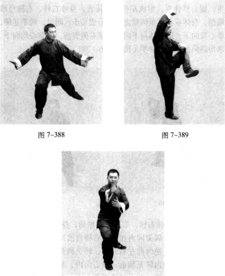 (3) 身体继续右转,右腿弓膝塌劲,身体重心移至右腿, 左腿屈膝提起,脚尖向内扣勾,右腿自然站直,形成右独立 势;同时,两手逆缠向左右分展,转至胸高,握拳;左臂屈 肘,左拳顺缠向内转至胸前,拳心向内,拳眼向上,右臂屈 肘,右拳继续逆缠,向上转至额前上方,拳心向前,拳眼向 下,眼看前方(图7-388、389)。